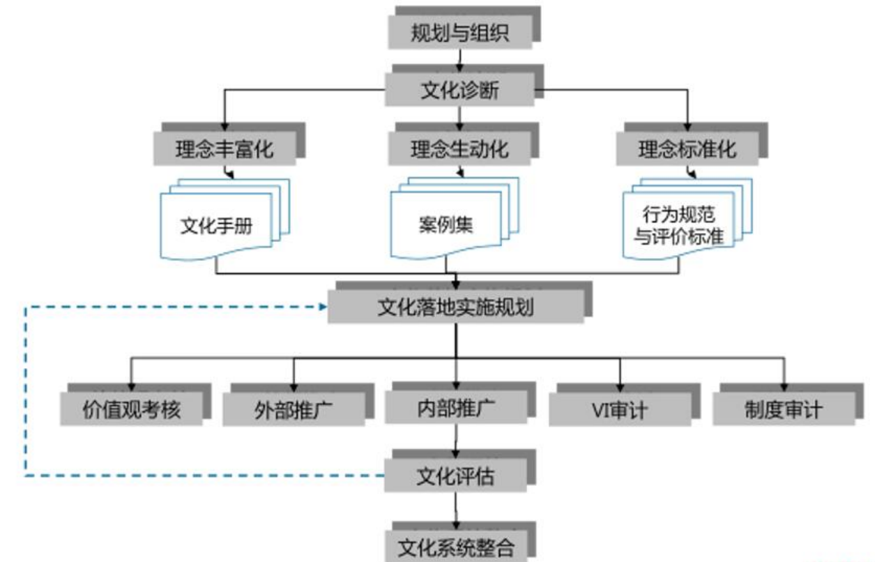 漢哲“企業(yè)文化咨詢工作地圖”,詳細(xì)描述了從文化落地實(shí)施規(guī)劃到文化定期評估與整合升華的全過程。