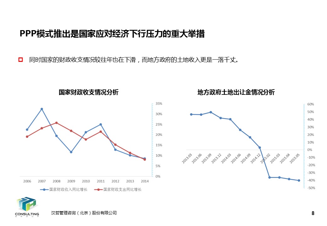 1、PPP模式推出是國(guó)家應(yīng)對(duì)經(jīng)濟(jì)下行壓力的重大舉措:國(guó)家近幾年GDP增長(zhǎng)率持續(xù)下滑,經(jīng)濟(jì)三駕馬車之一的投資尤其是固定資產(chǎn)投資增速也是不斷下滑,地方政府表現(xiàn)更加明顯,經(jīng)濟(jì)下行的壓力在加重。