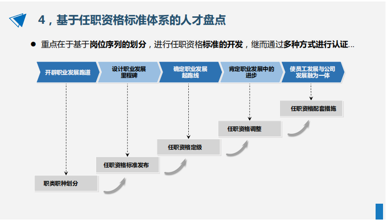 基于任職資格的人才盤點,強調(diào)基于崗位/崗位序列的關(guān)鍵職責(zé)進行知識、技能、能力、素質(zhì)、業(yè)績等綜合資質(zhì)的萃取與評價,更加強調(diào)任職者綜合資質(zhì)與所承擔(dān)的職責(zé)之間的業(yè)務(wù)關(guān)聯(lián)性。基于任職資格的人才盤點,一是有助于對戰(zhàn)略實現(xiàn)所需要的能力進行超前規(guī)劃;二是有助于知識萃取,將存在于少數(shù)員工心中、腦中的技能轉(zhuǎn)化為組織智商,促進“學(xué)習(xí)型組織”的建設(shè);三是有助于人才復(fù)制,即根據(jù)公司的知識地圖、能力地圖,批量生產(chǎn)人才,在人才管理的整個鏈條中占有主動權(quán)。