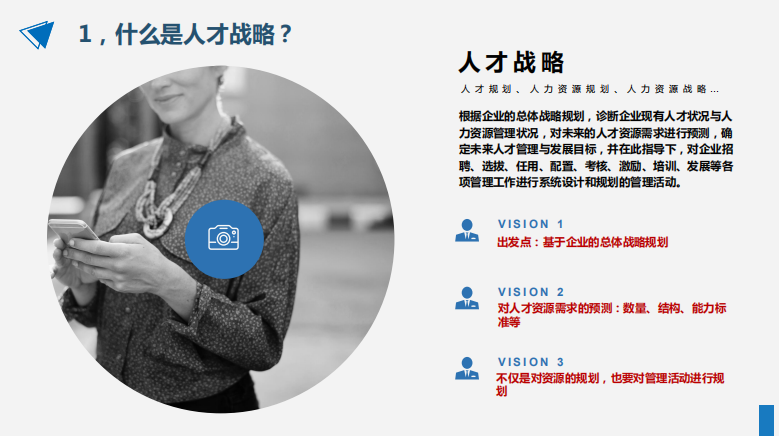 人才戰(zhàn)略,是根據(jù)企業(yè)的總體戰(zhàn)略規(guī)劃,診斷企業(yè)現(xiàn)有人才狀況與人力資源管理狀況,對未來的人才資源需求進行預(yù)測,確定未來人才管理與發(fā)展目標,并在此指導(dǎo)下,對企業(yè)招聘、選拔、任用、配置、考核、激勵、培訓(xùn)、發(fā)展等各項管理工作進行系統(tǒng)設(shè)計和規(guī)劃的管理活動。