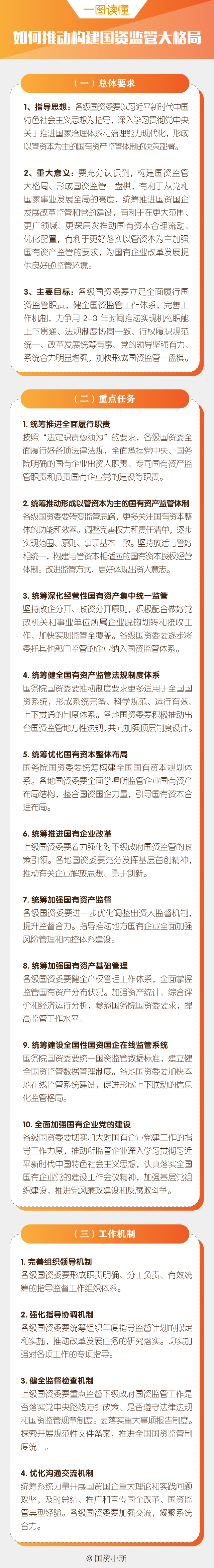 《通知》強(qiáng)調(diào),構(gòu)建國資監(jiān)管大格局的重點(diǎn)任務(wù)是,按照“法定職責(zé)必須為”的要求,統(tǒng)籌推進(jìn)全面履行職責(zé);轉(zhuǎn)變監(jiān)管思路,統(tǒng)籌推動(dòng)形成以管資本為主的國有資產(chǎn)監(jiān)管體制;堅(jiān)持政企分開、政資分開原則,統(tǒng)籌深化經(jīng)營性國有資產(chǎn)集中統(tǒng)一監(jiān)管;加強(qiáng)頂層制度設(shè)計(jì),統(tǒng)籌健全國有資產(chǎn)監(jiān)管法規(guī)制度體系;落實(shí)國家發(fā)展戰(zhàn)略,統(tǒng)籌優(yōu)化國有資本整體布局;圍繞培育具有全球競爭力的世界一流企業(yè),統(tǒng)籌推進(jìn)國有企業(yè)改革;聚焦防止國有資產(chǎn)流失,統(tǒng)籌加強(qiáng)國有資產(chǎn)監(jiān)督;全面掌握國有資產(chǎn)分布狀況,統(tǒng)籌加強(qiáng)國有資產(chǎn)基礎(chǔ)管理;強(qiáng)化事中事后監(jiān)管,統(tǒng)籌建設(shè)全國性國資國企在線監(jiān)管系統(tǒng);堅(jiān)定維護(hù)黨中央權(quán)威和集中統(tǒng)一領(lǐng)導(dǎo),全面加強(qiáng)國有企業(yè)黨的建設(shè)。
