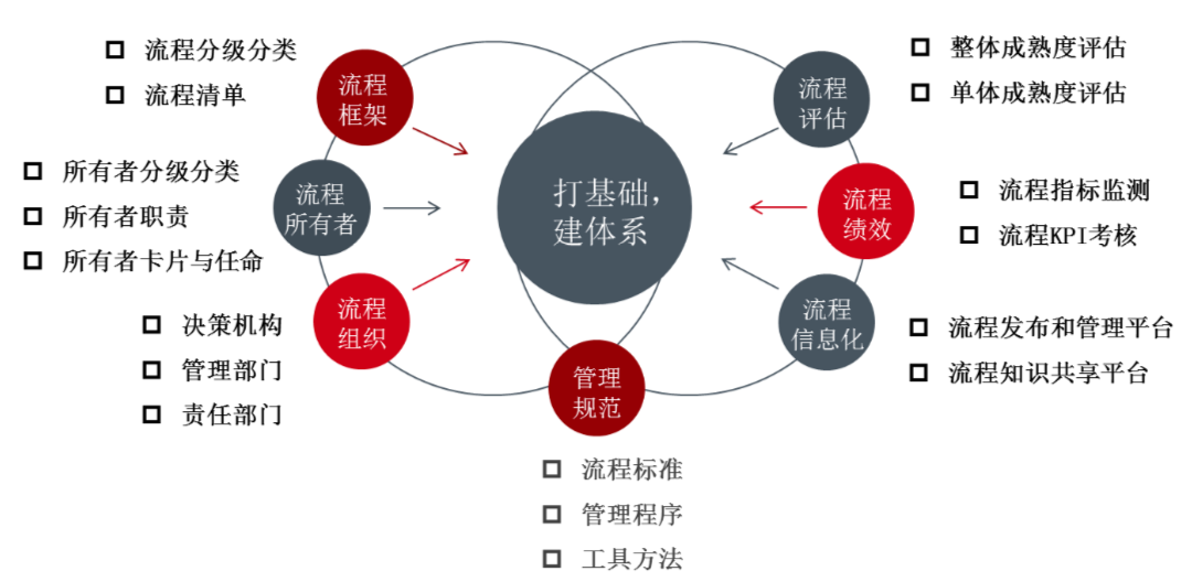 本次項目以“打基礎(chǔ),建體系”為主要目標,為確保形成一套具有可操作性、系統(tǒng)性的流程管理閉環(huán)機制,工作組從流程框架、流程所有者、流程組織、流程評估、流程績效、流程信息化、管理規(guī)范七個維度進行銀行流程管理的體系搭建和規(guī)則設(shè)計。