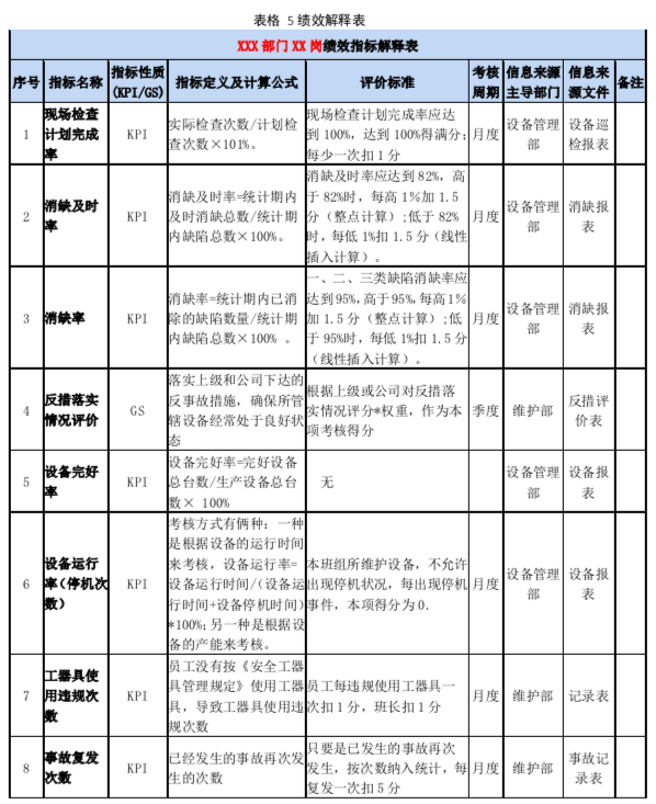 規(guī)范績效解釋表,明確指標(biāo)名稱標(biāo)準(zhǔn)、指標(biāo)性質(zhì)、指標(biāo)定義及計(jì)算公式、評(píng)價(jià)標(biāo)準(zhǔn)、考核周期、信息來源主導(dǎo)部門、信息來源文件。定期對(duì)績效解釋表進(jìn)行修訂維護(hù)。