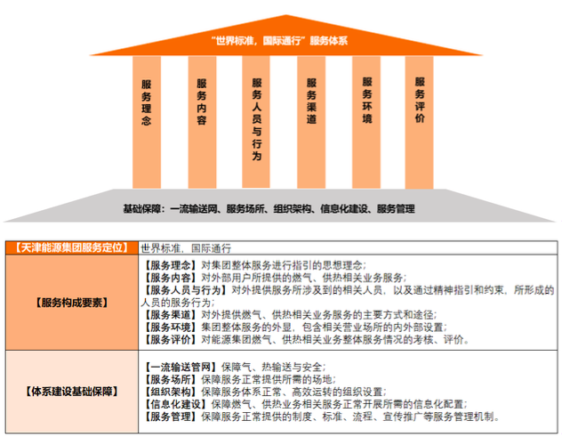 在服務(wù)體系框架搭建中,對集團(tuán)內(nèi)部服務(wù)燃?xì)狻⒐岱?wù),以用戶體驗(yàn)為主線,進(jìn)行服務(wù)全生命周期梳理,并提煉了服務(wù)理念、服務(wù)內(nèi)容、服務(wù)人員與行為、服務(wù)渠道、服務(wù)環(huán)境、服務(wù)評價(jià)六大服務(wù)構(gòu)成要素,在此基礎(chǔ)上,搭建了能源服務(wù)保障體系框架。如下所示: