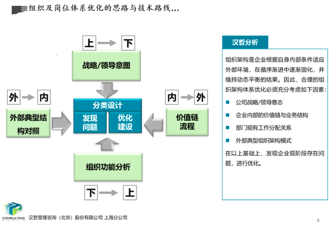 項目組從戰(zhàn)略意圖、價值鏈流程、組織功能分析、外部借鑒四個維度對公司的組織體系進(jìn)行了分析與優(yōu)化,提出了公司當(dāng)前的組織架構(gòu)優(yōu)化方案以及中長期組織架構(gòu)優(yōu)化與調(diào)整思路。