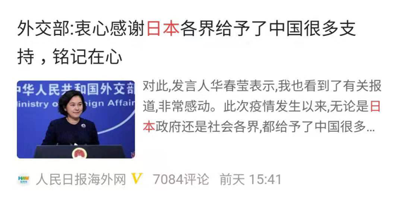 疫情一發(fā)生,日本政府就表示將全力協(xié)助中國抗擊疫情。日本政府和日本許多地方、企業(yè)主動向中方捐贈口罩、護(hù)目鏡、防護(hù)服等防疫物資。