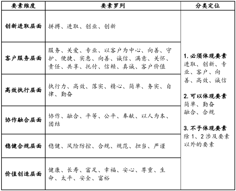文化要素主輔邏輯定位重點是在諸多已經(jīng)提煉的文化要素基礎(chǔ)上,對文化要素的提及頻次、重要程度、要素邏輯關(guān)系進(jìn)行標(biāo)記和初步判定。明確哪些要素是核心要素,哪些要素是輔助要素;明確哪些必須要體現(xiàn)的,哪些要素是可能會體現(xiàn)的,哪些要素是沒必要體現(xiàn)的。這一過程,實際上是對已經(jīng)提煉的文化要素進(jìn)行的二次篩選和定位,為后續(xù)的文化理念建設(shè)提供輸入信息準(zhǔn)備。
