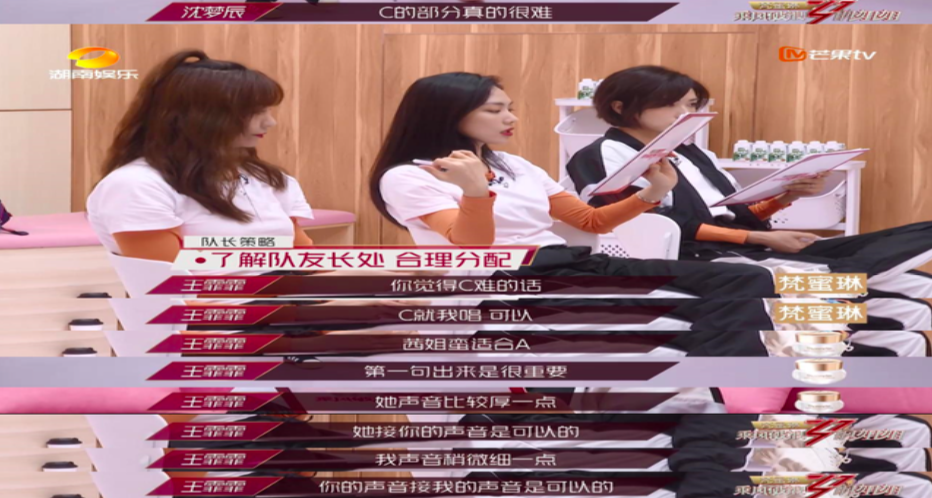 情景12:在第二次公演排練的過(guò)程中,丁當(dāng)(隊(duì)長(zhǎng))根據(jù)每個(gè)人的特色分配最適合的段落,也會(huì)調(diào)整隊(duì)員唱歌的小問(wèn)題。