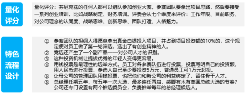 2、用錢投票,可杜絕人情關(guān)系,選出最好的創(chuàng)業(yè)項目和團隊;人人平等,每位員工都可報名參加創(chuàng)業(yè)大賽,打破新員工職位無法超過老員工的企業(yè)倫理困境。