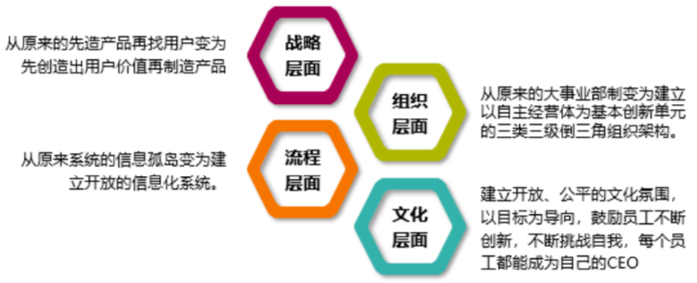 對外緊跟時代發(fā)展,以創(chuàng)造用戶需求為導(dǎo)向持續(xù)進行管理創(chuàng)新;對內(nèi)以人為本,在企業(yè)內(nèi)部建立起一種公平高效的機制,為員工搭建一個“我的用戶我創(chuàng)造,我的增值我分享”的自我實現(xiàn)平臺。具體可分為四個層面。