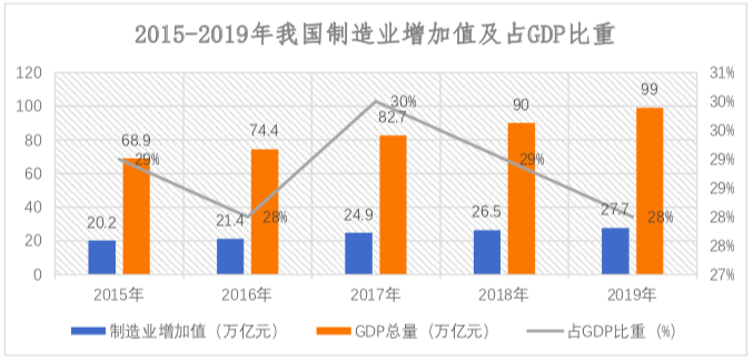 經(jīng)過數(shù)十年的發(fā)展,我國制造業(yè)不斷發(fā)展壯大,中國也成為了世界加工制造中心,根據(jù)國家統(tǒng)計局數(shù)據(jù)顯示,2019年我國制造業(yè)增加值為27.7萬億元,持續(xù)占國民生產(chǎn)總值(GDP)28%左右的比重,行業(yè)規(guī)模不斷增大。