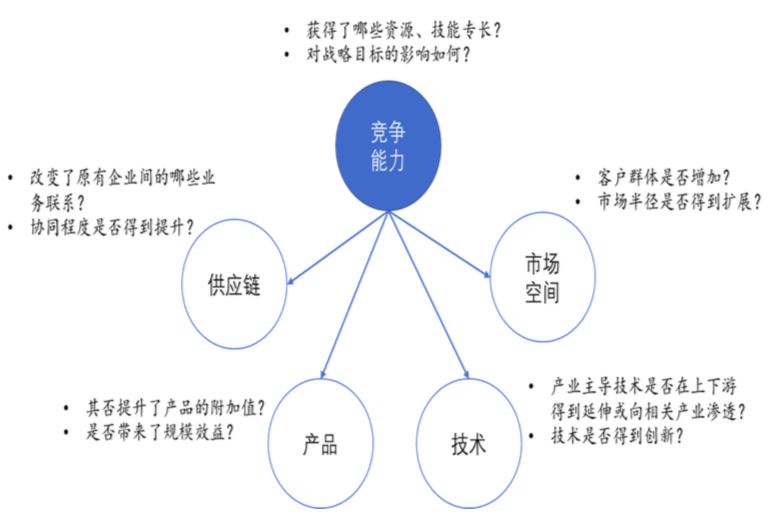 產(chǎn)業(yè)整合的相關(guān)理論研究觀點(diǎn)豐富,較有代表性的一是從市場的資源配置效率出發(fā)的“結(jié)構(gòu)—行為—績效”分析范式,主要考察市場集中度、進(jìn)入壁壘、產(chǎn)品差別化程度等市場結(jié)構(gòu)狀況對(duì)企業(yè)價(jià)格和產(chǎn)量決策的影響;二是從交易費(fèi)用理論出發(fā),以成本節(jié)約的程度與資產(chǎn)專用性程度、資產(chǎn)被利用的頻繁程度和環(huán)境的不確定程度等因素分析產(chǎn)業(yè)整合的價(jià)值;三是從企業(yè)能力理論出發(fā),解釋產(chǎn)業(yè)整合是重新調(diào)整企業(yè)間能力分布,從而帶來經(jīng)營價(jià)值的過程。各種理論多來自產(chǎn)業(yè)經(jīng)濟(jì)學(xué)的經(jīng)典理論,也不乏諾貝爾大神的加持,確實(shí)帶來很多有益的啟示,漢哲從經(jīng)典理論研究和咨詢實(shí)踐出發(fā),提出了“1+4”產(chǎn)業(yè)整合評(píng)估模型,既一個(gè)核心,企業(yè)競爭能力得到了哪些增值,四個(gè)影響維度,從供應(yīng)鏈、產(chǎn)品、技術(shù)、市場空間具體分析產(chǎn)業(yè)整合所帶來的預(yù)期增值是什么。其中,企業(yè)產(chǎn)業(yè)整合的核心是競爭能力的提升,以解決戰(zhàn)略實(shí)現(xiàn)的過程性問題,因此需要從戰(zhàn)略任務(wù)和外部市場環(huán)境的角度對(duì)并購的價(jià)值做出考量,同時(shí),所有的產(chǎn)業(yè)并購行為,必然帶來產(chǎn)業(yè)鏈的具體變化,而這些變化也將成為競爭能力提升的具體外延,變化的程度和質(zhì)量則直接決定競爭能力增值實(shí)現(xiàn)的多少。