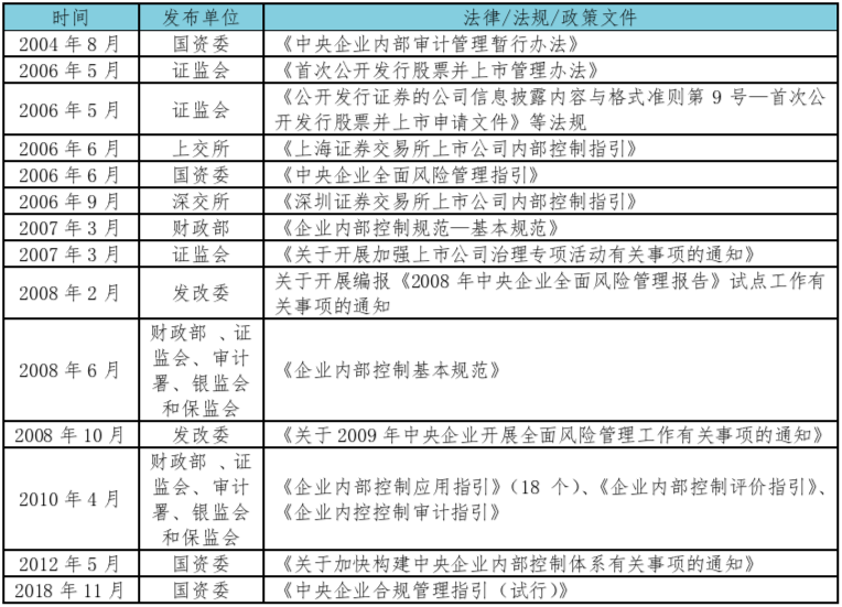 以上便是我們所熟知的“一規(guī)范三指引”,并且在國有企業(yè)內(nèi)控體系建設(shè)及評價(jià),外部審計(jì)機(jī)構(gòu)審計(jì)中被廣泛引用。