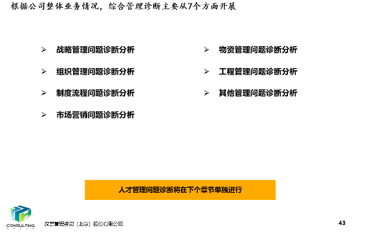 綜合管理診斷主要從戰(zhàn)略管理、組織管理、制度流程、市場(chǎng)營(yíng)銷、物資管理、工程管理及其他管理方面,分別進(jìn)行了診斷。對(duì)人才管理問題的診斷,考慮到項(xiàng)目后續(xù)涉及人才隊(duì)伍建設(shè)規(guī)劃及培養(yǎng),單獨(dú)作為一個(gè)章節(jié)進(jìn)行更為細(xì)致的診斷。