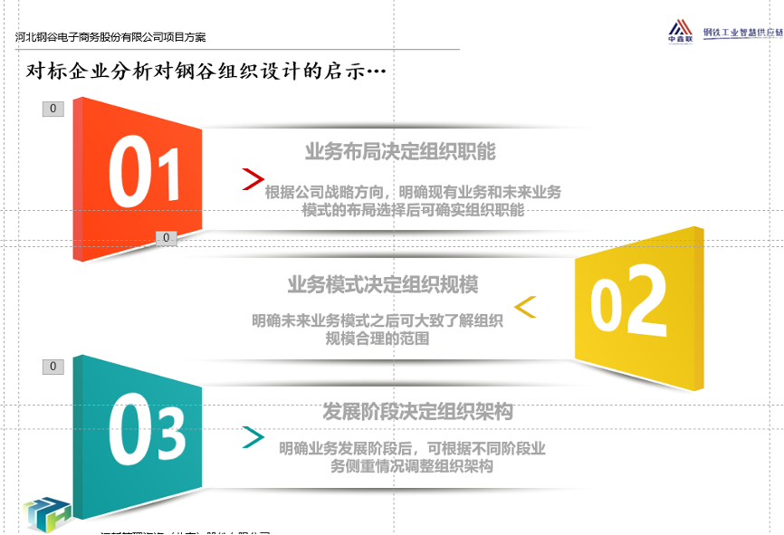 3、著眼未來?;阡摴裙具\(yùn)營模式、業(yè)務(wù)板塊、發(fā)展規(guī)劃,設(shè)置與之相匹配的組織架構(gòu),既能夠承接目前公司發(fā)展現(xiàn)狀,又能夠滿足未來5年公司的發(fā)展需求,優(yōu)化鋼谷的組織架構(gòu)、部門設(shè)置及人員編制。