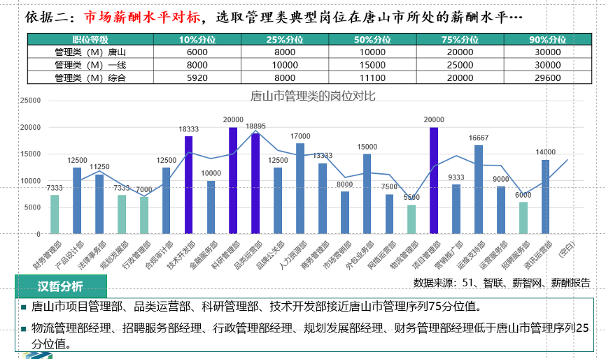 2、對(duì)標(biāo)外部崗位薪酬水平。通過對(duì)標(biāo)北上廣等一線城市、唐山市典型崗位各分位值的薪酬水平,運(yùn)用對(duì)標(biāo)崗位的跟隨策略及領(lǐng)先策略,確定各崗位的薪酬水平中位值,確定各崗位的薪酬值,保證公司薪酬水平在市場(chǎng)上有一定的競爭性。