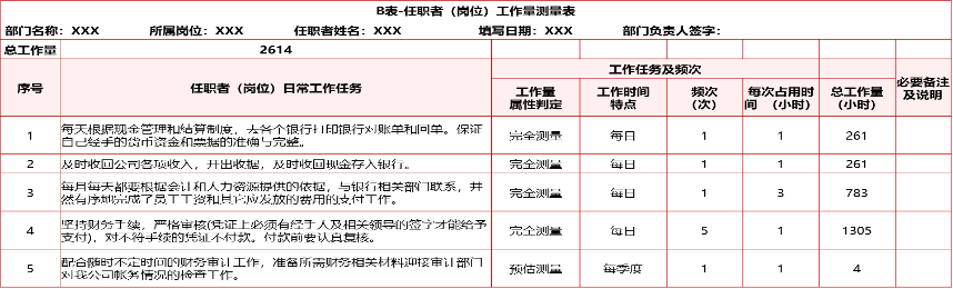 (3)工作量測(cè)量法:是通過(guò)對(duì)員工的實(shí)際工作時(shí)間進(jìn)行統(tǒng)計(jì)分析,計(jì)算部門(mén)編制彈性系數(shù)及各員工工作負(fù)荷度,以衡定部門(mén)及崗位員工編制的合理性。如下表: