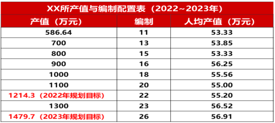 (2)生產(chǎn)部門(mén)定崗定編方案:通過(guò)《定崗定編職能套表》的履職情況評(píng)估、DPE崗位分析與工作量測(cè)量,并結(jié)合實(shí)際情況(戰(zhàn)略目標(biāo)、重點(diǎn)任務(wù)、人員能力等),對(duì)各部門(mén)職責(zé)進(jìn)行梳理,對(duì)各崗位進(jìn)行撤銷、合并、拆分、增設(shè)或職責(zé)調(diào)整;結(jié)合各生產(chǎn)部門(mén)過(guò)往四年(2018~2021年)與未來(lái)兩年(2022年、2023年)的人員數(shù)量、部門(mén)產(chǎn)值、合同金額等數(shù)據(jù),通過(guò)計(jì)算公式“本年度建議編制=【(本年度部門(mén)產(chǎn)值/上一年部門(mén)產(chǎn)值- 1)*0.9(調(diào)節(jié)系數(shù))+1】*上一年部門(mén)人數(shù)”,制定《產(chǎn)值與編制配置表(2022~2023年)》,如下圖: