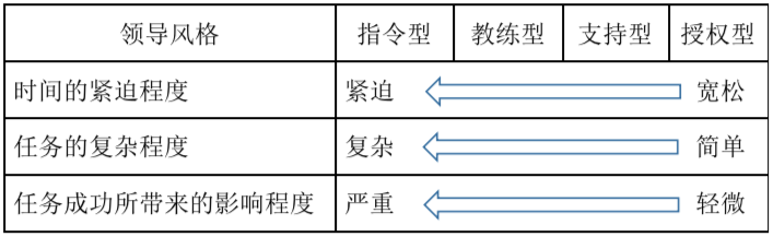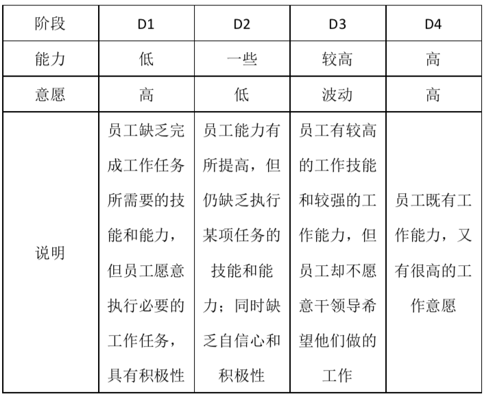 任務(wù)和目標改變,員工很有可能從D4一下變?yōu)镈1。例如,一位技術(shù)工程師技能水平高,工作積極,但晉升為項目經(jīng)理,在項目管理和預(yù)算管理方面比較弱,在技術(shù)方面可以采用支持型或授權(quán)型的領(lǐng)導(dǎo)風格,在項目管理和預(yù)算管理方面應(yīng)該采取指令型或教練型領(lǐng)導(dǎo)風格。