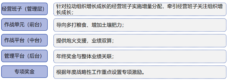 獎金設(shè)計導(dǎo)向經(jīng)營使命的達成,糧食與肥力兼顧,關(guān)注多打糧食的同時,也考慮增加土壤肥力,通過“戰(zhàn)略補貼、戰(zhàn)略專項”強化戰(zhàn)略落地及關(guān)鍵突破。