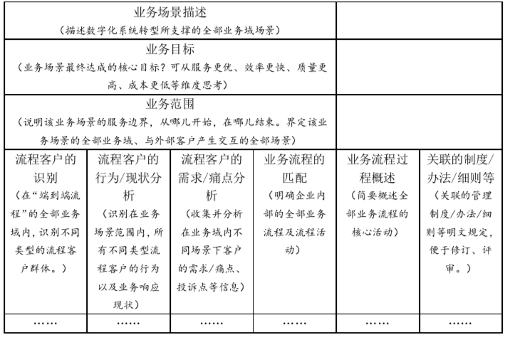 為有效構(gòu)建數(shù)字化平臺的轉(zhuǎn)型模型,從數(shù)字化系統(tǒng)支撐的全部業(yè)務(wù)域,或與外部客戶產(chǎn)生交互的全部業(yè)務(wù)場景出發(fā),識別出該業(yè)務(wù)域內(nèi)的“端到端流程”。再以“端到端流程”為客戶創(chuàng)造價(jià)值、高效實(shí)現(xiàn)業(yè)務(wù)目標(biāo)為導(dǎo)向,結(jié)合客戶需求及客戶觸點(diǎn)中流程運(yùn)行的問題開展流程優(yōu)化,驅(qū)動數(shù)字化平臺轉(zhuǎn)型的支撐,從而解決業(yè)務(wù)問題,或達(dá)成業(yè)務(wù)目標(biāo)。