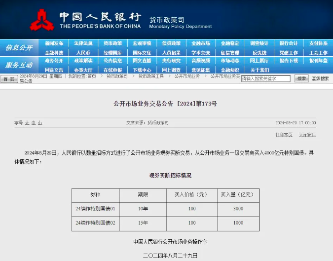 8月29日,中國人民銀行以數(shù)量招標(biāo)方式進(jìn)行了公開市場業(yè)務(wù)現(xiàn)券買斷交易,從公開市場業(yè)務(wù)一級(jí)交易商買入4000億元特別國債。其中,10年期24續(xù)作特別國債01買入量3000億元,15年期24續(xù)作特別國債02買入量1000億元。