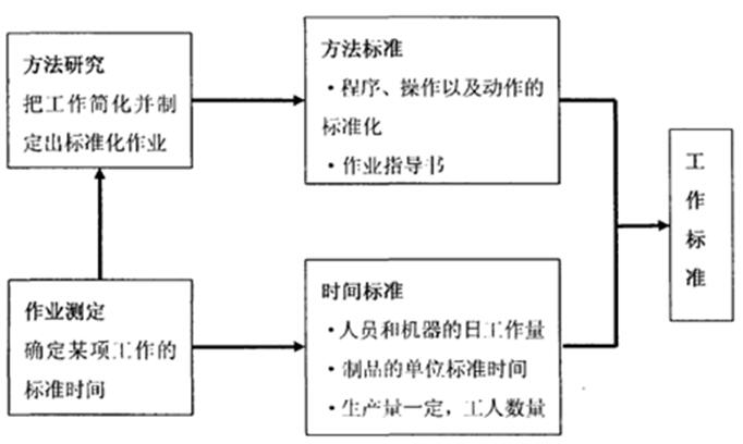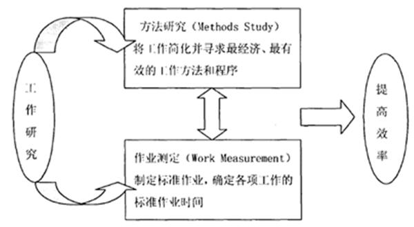 其中:方法研究和作業(yè)測(cè)定是工業(yè)領(lǐng)域的兩大技術(shù)。作業(yè)測(cè)定是方法研究的基礎(chǔ),方法研究是在現(xiàn)有作業(yè)(作業(yè)測(cè)定后制定的新的標(biāo)準(zhǔn)作業(yè))的基礎(chǔ)上,對(duì)其方法進(jìn)行研究分析,尋求最合理的作業(yè)順序,并用來(lái)制定新的作業(yè)方法,方法研究的目的是為作業(yè)測(cè)定提供研究的基礎(chǔ),它包括程序分析、操作分析和動(dòng)作分析;方法研究作為作業(yè)測(cè)定的基礎(chǔ),作業(yè)測(cè)定是在新方法(方法研究改善后的新方法)的基礎(chǔ)上,對(duì)作業(yè)單元進(jìn)行研究分析,確定各項(xiàng)作業(yè)的標(biāo)準(zhǔn)作業(yè)時(shí)間,并編制作業(yè)指導(dǎo)書,作為一種指導(dǎo)方法,作業(yè)測(cè)定的目的是便于方法研究的改善,它包括秒表時(shí)間研究、工作抽樣、預(yù)定時(shí)間法和標(biāo)準(zhǔn)資料法。