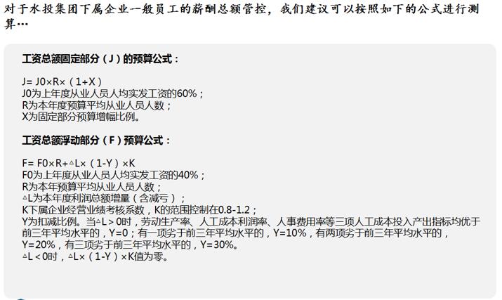 3、制定子公司一般員工薪酬總額管理辦法。根據(jù)子公司的企業(yè)規(guī)模、經(jīng)營業(yè)績情況、同行業(yè)市場薪酬水平等因素合理確定一般員工的薪酬總額,既能確保子公司薪酬總額總體可控,又能激勵各子公司創(chuàng)造良好的經(jīng)濟效益。