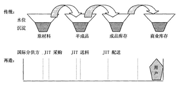 物流整合開(kāi)始后,第一步就是整合采購(gòu),將集團(tuán)所有事業(yè)部的物資集中采購(gòu),通過(guò)規(guī)模優(yōu)勢(shì),納入國(guó)際化供應(yīng)商,在全球范圍內(nèi)采購(gòu)質(zhì)優(yōu)價(jià)廉的零部件,既降低產(chǎn)品成本、提高產(chǎn)品的競(jìng)爭(zhēng)力,又保持了產(chǎn)品質(zhì)量的一致性。有的分供方還直接參與了海爾的產(chǎn)品設(shè)計(jì),通過(guò)與國(guó)際化分供方建立起密切合作的伙伴關(guān)系,實(shí)現(xiàn)了采購(gòu)JIT。同時(shí),在內(nèi)部實(shí)施ERP管理系統(tǒng),通過(guò)以ERP為后臺(tái)的B2B網(wǎng)上采購(gòu)與網(wǎng)上招標(biāo)、網(wǎng)上支付,實(shí)現(xiàn)了集團(tuán)內(nèi)部生產(chǎn)、庫(kù)存、銷(xiāo)售、財(cái)務(wù)、人力資源與外部供應(yīng)商和分銷(xiāo)商信息的共享與共同計(jì)劃,最大限度地縮短了采購(gòu)周期。在儲(chǔ)運(yùn)方面,統(tǒng)一運(yùn)輸,優(yōu)化運(yùn)輸網(wǎng)絡(luò),通過(guò)SST機(jī)制整合郵政的配送網(wǎng)絡(luò),為零距離銷(xiāo)售提供了保證。在生產(chǎn)物資配送方面,實(shí)施JIT送料,加快了庫(kù)存資金的周轉(zhuǎn)速度,減少了呆滯物資。整合前,各配送處以滿足生產(chǎn)不停線為目標(biāo),生產(chǎn)線用量往往達(dá)不到2天以上,遇到計(jì)劃變動(dòng),有些物料又未及時(shí)辦理退庫(kù),時(shí)間一長(zhǎng)就會(huì)變成呆滯物料,造成浪費(fèi);整合后,物流的目標(biāo)是零庫(kù)存資金占用,在這個(gè)思想的指導(dǎo)下,推行了4HJIT送料,即控制物資在線時(shí)間不得超過(guò)4個(gè)小時(shí),超過(guò)4小時(shí)立即退庫(kù)查明原因,按照SST契約進(jìn)行處理,1小時(shí)之內(nèi)的立即補(bǔ)料,使現(xiàn)場(chǎng)明亮整潔,呆滯物資減少了50%。1999年9月15日,國(guó)際化的海爾物流中心啟用,物流中心擁有9160個(gè)庫(kù)位,采用世界最為先進(jìn)的資源管理集成系統(tǒng),實(shí)行“JIT"生產(chǎn)模式管理。流程再造前后物流對(duì)照如下圖3所示。