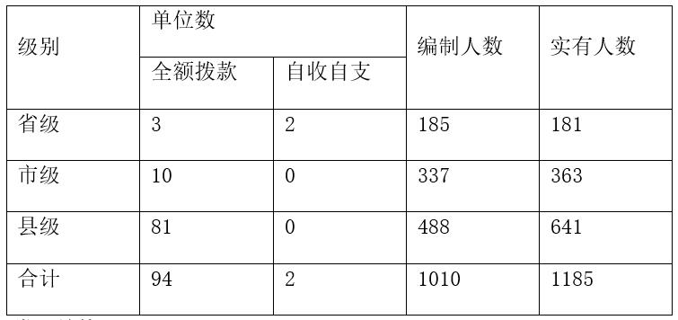藥監(jiān)系統(tǒng)包含了省屬、市屬和縣屬事業(yè)單位。省屬事業(yè)單位共有5個,從經(jīng)費(fèi)來源看,其中3個為全額撥款事業(yè)單位,2個為自收自支事業(yè)單位;市屬事業(yè)單位10個,縣屬事業(yè)單位81個,全部為全額撥款事業(yè)單位。如表所示: