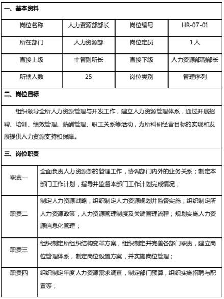 通過工作分析對崗位有了更為清晰了解的基礎(chǔ)上,形成了規(guī)范的《人力資源部部長崗位說明書》。