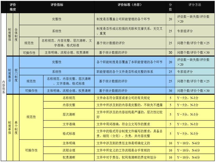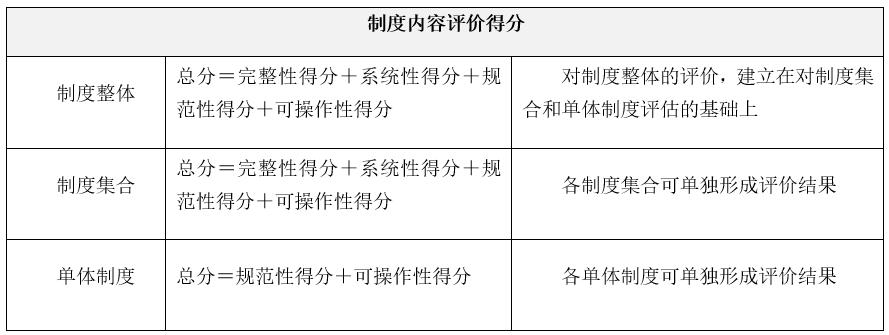 根據(jù)《制度內(nèi)容評(píng)估模型》,通常應(yīng)分別對(duì)制度整體(全體制度)、制度集合(部門(mén)制度)和制度單體(單體制度)三個(gè)層面進(jìn)行評(píng)價(jià),每個(gè)層面均從制度的完整性、系統(tǒng)性、規(guī)范性和可操作性四個(gè)指標(biāo)進(jìn)行評(píng)價(jià),依據(jù)對(duì)應(yīng)的評(píng)估標(biāo)準(zhǔn)(內(nèi)容)和評(píng)分方法進(jìn)行打分,每個(gè)層面滿分100分,指標(biāo)的權(quán)重由該指標(biāo)在本層面制度管理中的重要性決定,指標(biāo)的得分,由專家打分及針對(duì)制度的評(píng)審、分析和統(tǒng)計(jì)確定。