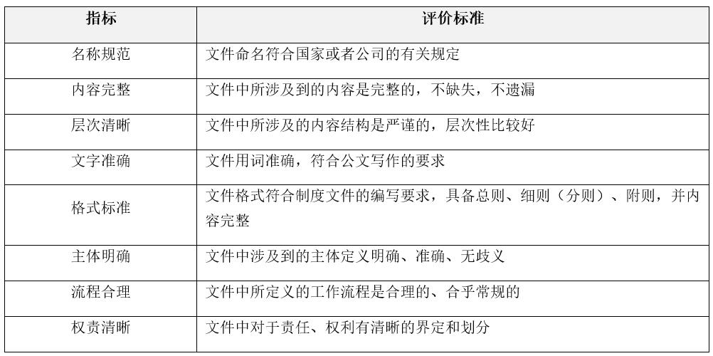 本方向的評(píng)估重點(diǎn)包括:制度體系文件的層次是否清晰;各項(xiàng)制度之間是否出現(xiàn)矛盾的情況,制度之間的配套性、關(guān)聯(lián)度是否足夠,接口是否清晰;整個(gè)制度體系是否缺少必要的程序性、支持性文件(如:作業(yè)標(biāo)準(zhǔn)、作業(yè)指導(dǎo)書(shū)、崗位操作手冊(cè),等等)。