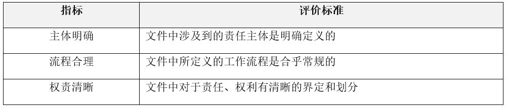 本方向的評(píng)估重點(diǎn)包括:制度內(nèi)容是否有針對(duì)性,是否有較強(qiáng)的可執(zhí)行性,在解決問(wèn)題的具體規(guī)定和措施上是否全面,對(duì)實(shí)際工作是否有指導(dǎo)意義;制度中涉及的定義和范圍等,用詞是否過(guò)于寬泛,是否存在歧義,等等。