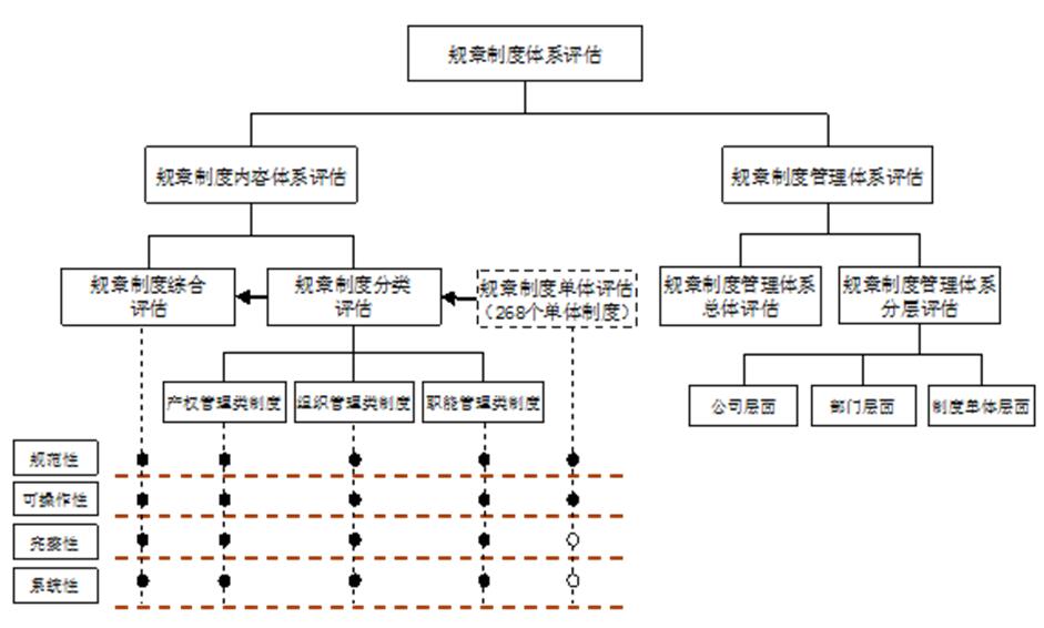 對(duì)規(guī)章制度內(nèi)容的評(píng)估,分為單體評(píng)估、分類(lèi)評(píng)估和綜合評(píng)估三個(gè)層次開(kāi)展,后兩個(gè)評(píng)估都是建立在單體評(píng)估的基礎(chǔ)之上。其中: