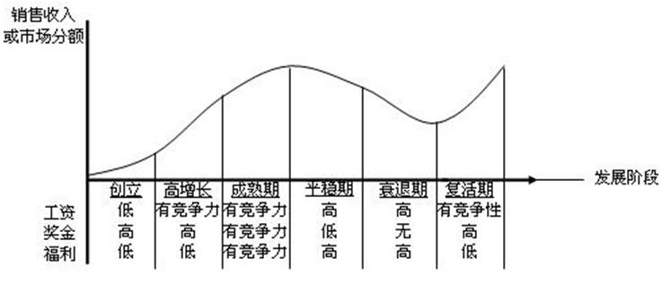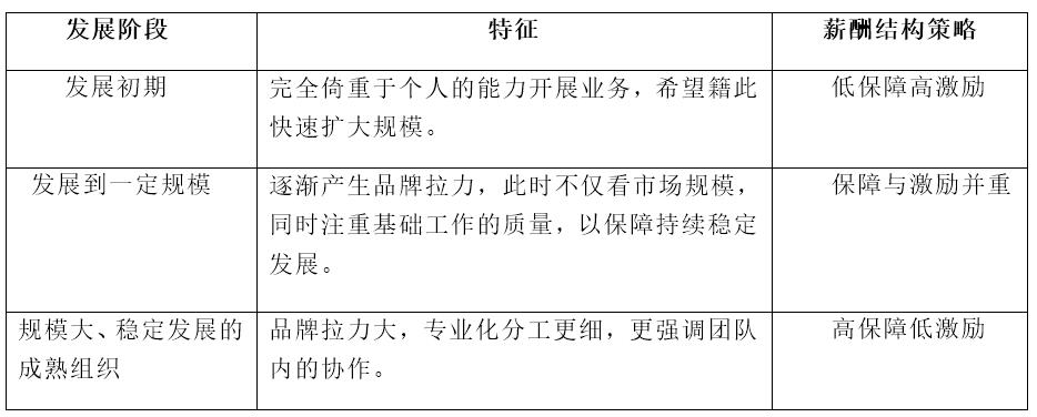 在實(shí)際應(yīng)用中,一般都是績效薪酬和基本薪酬各占一定的比例。當(dāng)兩者比例不斷調(diào)和變化時(shí),這種薪酬模型可以演變?yōu)橐约顬橹鞯哪P?,也可以演變?yōu)橐苑€(wěn)定為主的薪酬模型。伴隨著組織的發(fā)展,不同的發(fā)展階段薪酬結(jié)構(gòu)策略也是不盡相同的,如以下圖表所示: