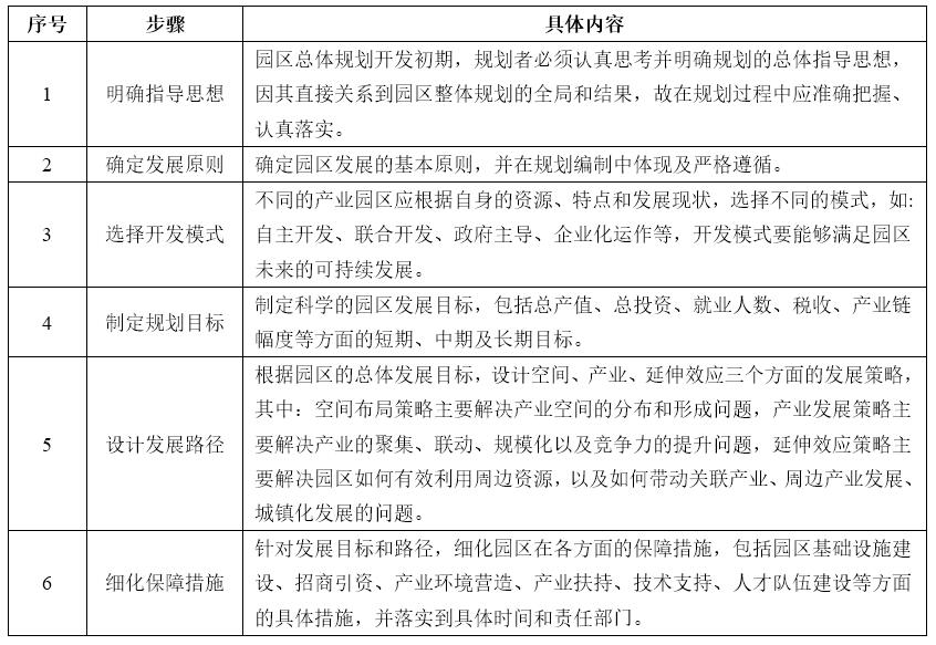 針對上述問題,各產(chǎn)業(yè)園區(qū)都在探索各自的發(fā)展道路,如:爭取政策支持、產(chǎn)城融合、突出技術優(yōu)勢,等等。通常來看,產(chǎn)業(yè)園區(qū)規(guī)劃大致包括如下六大步驟,如下表所示: